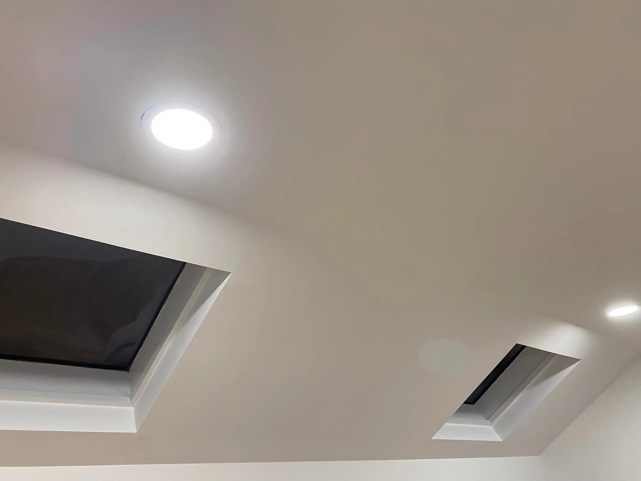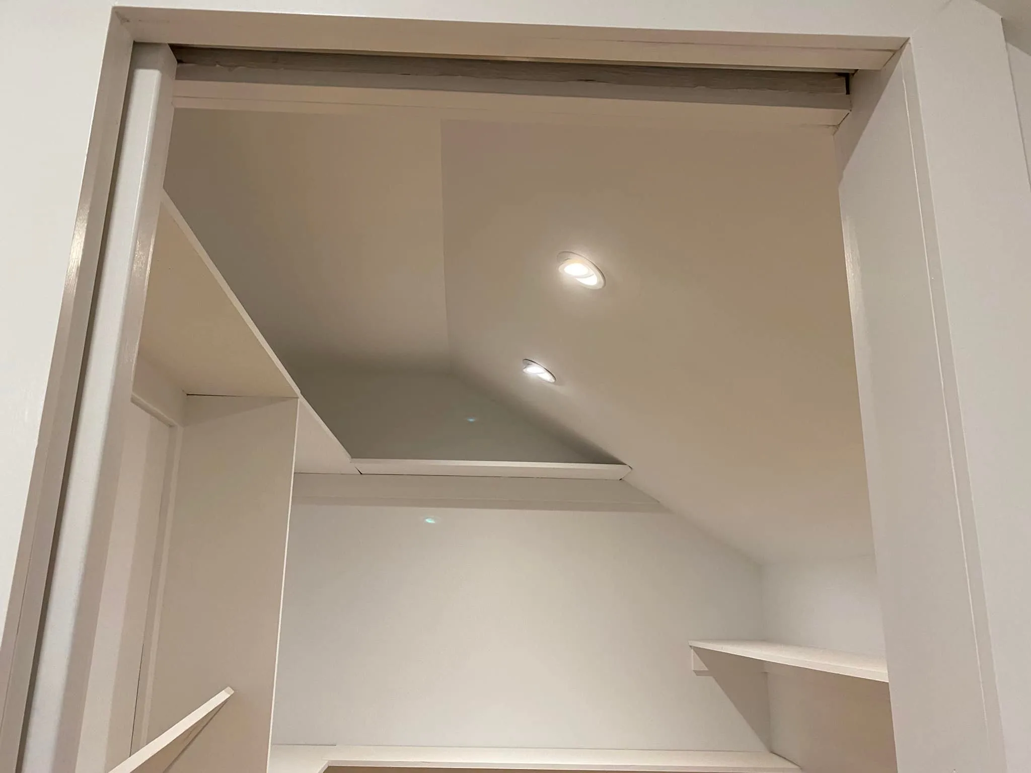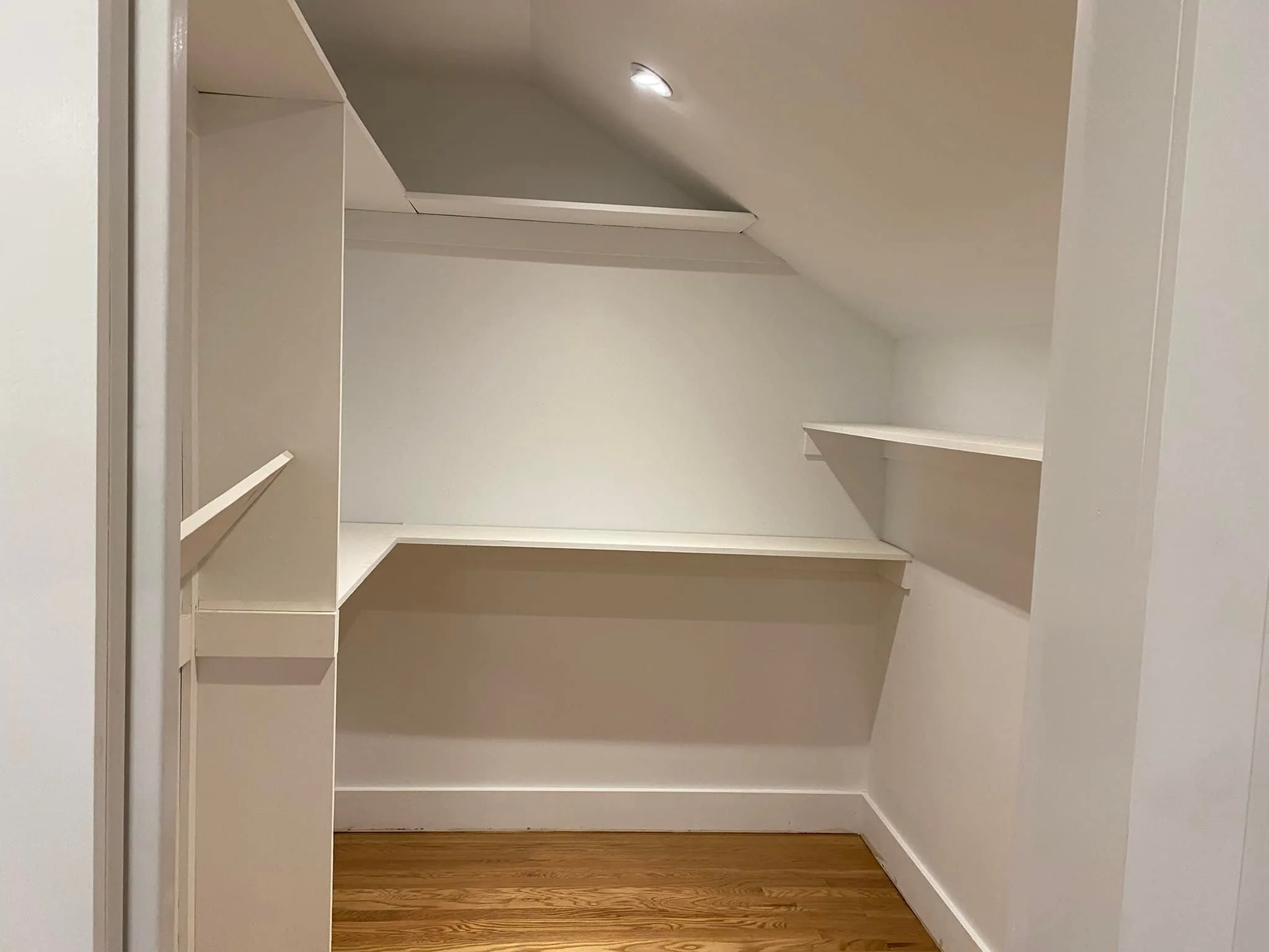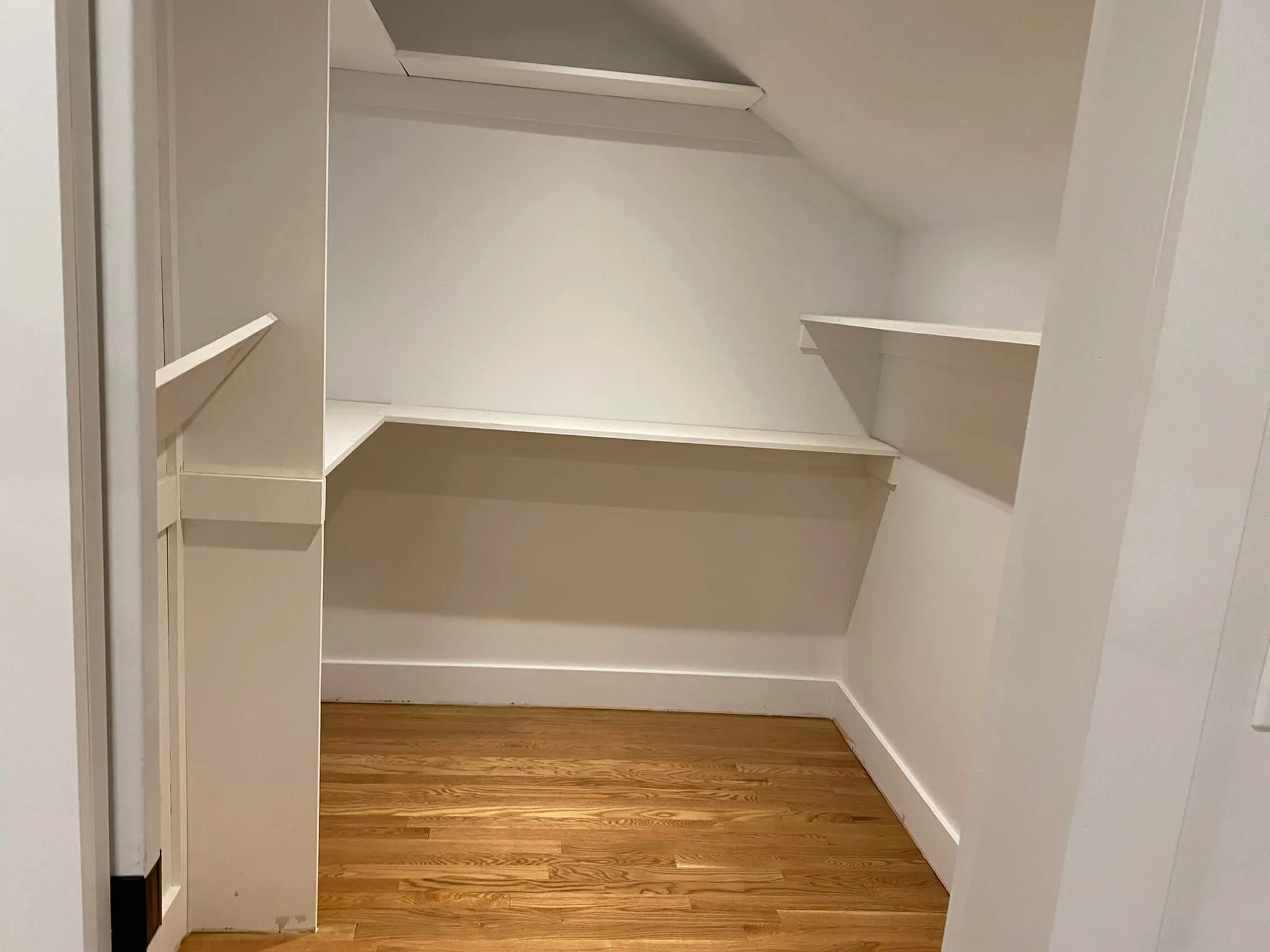 This project involved extensive custom closet carpentry and painting to fully finish the storage space. Initially, the structural framing and woodwork were completed to build sturdy, multi-level shelving tailored to accommodate the sloped ceiling. Following the carpentry phase, comprehensive painting was executed to ensure all surfaces, including the newly built shelves and existing skylight wells, received a seamless, crisp white coat. Ultimately, these combined efforts resulted in a highly functional, well-lit, and cleanly finished interior area.
