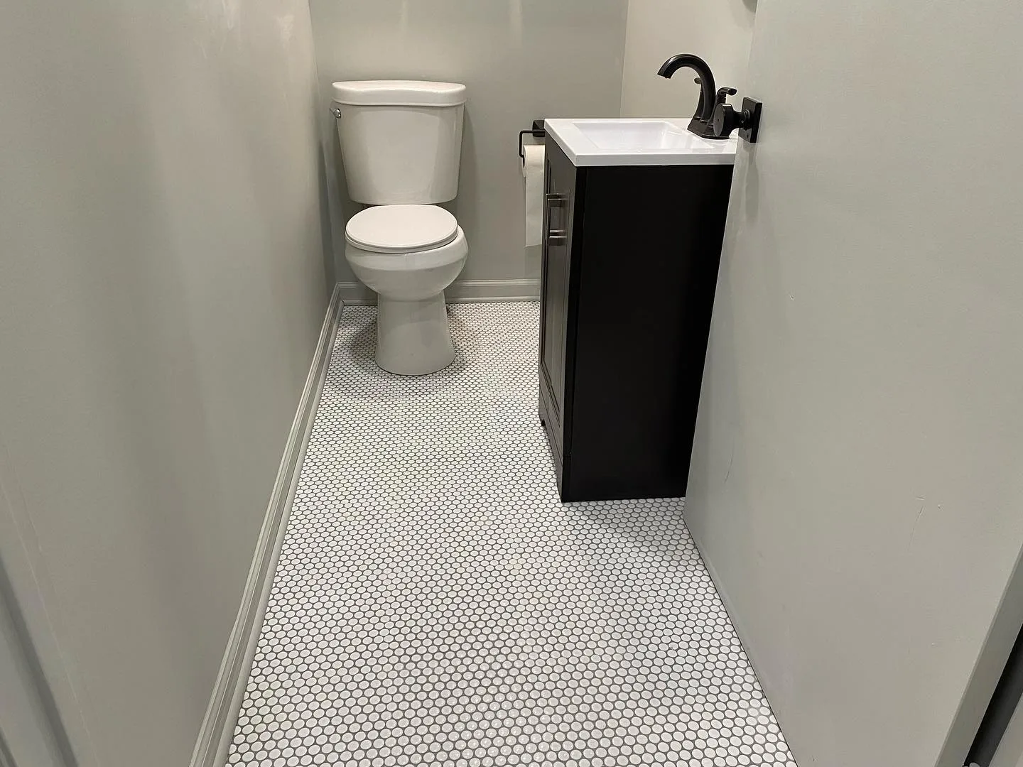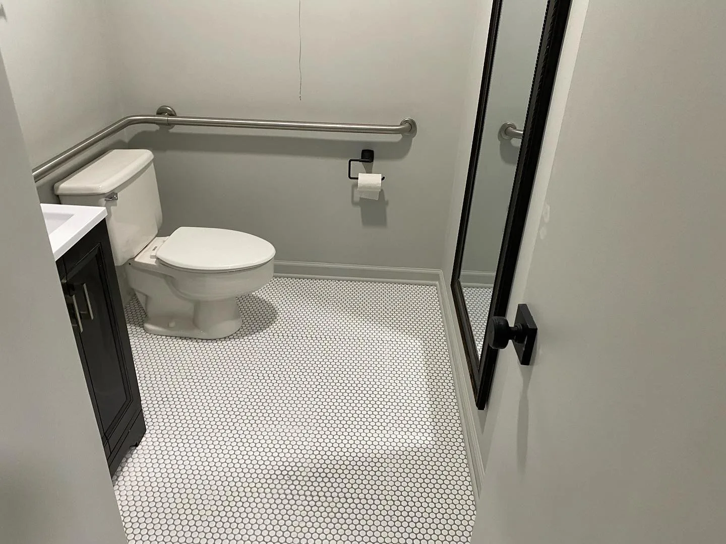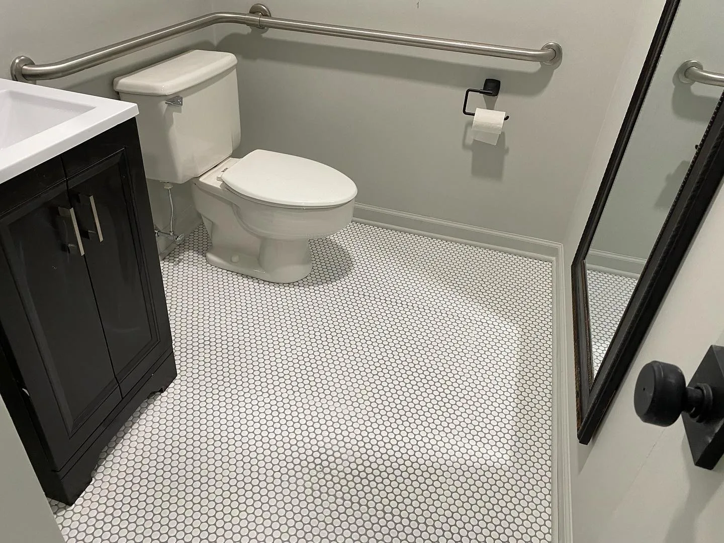 This project involved the complete update of a commercial bathroom in Stratford, CT, to improve both functionality and accessibility. First, the existing flooring was replaced with durable white penny mosaic tiles, establishing a clean, slip-resistant surface. Subsequently, a compact black vanity with a modern matte black faucet was installed to maximize spatial efficiency. Furthermore, ADA-compliant stainless steel grab bars were securely mounted alongside the toilet to ensure proper safety standards are met. Overall, the renovated space provides a practical, well-lit environment strictly tailored for everyday commercial use.