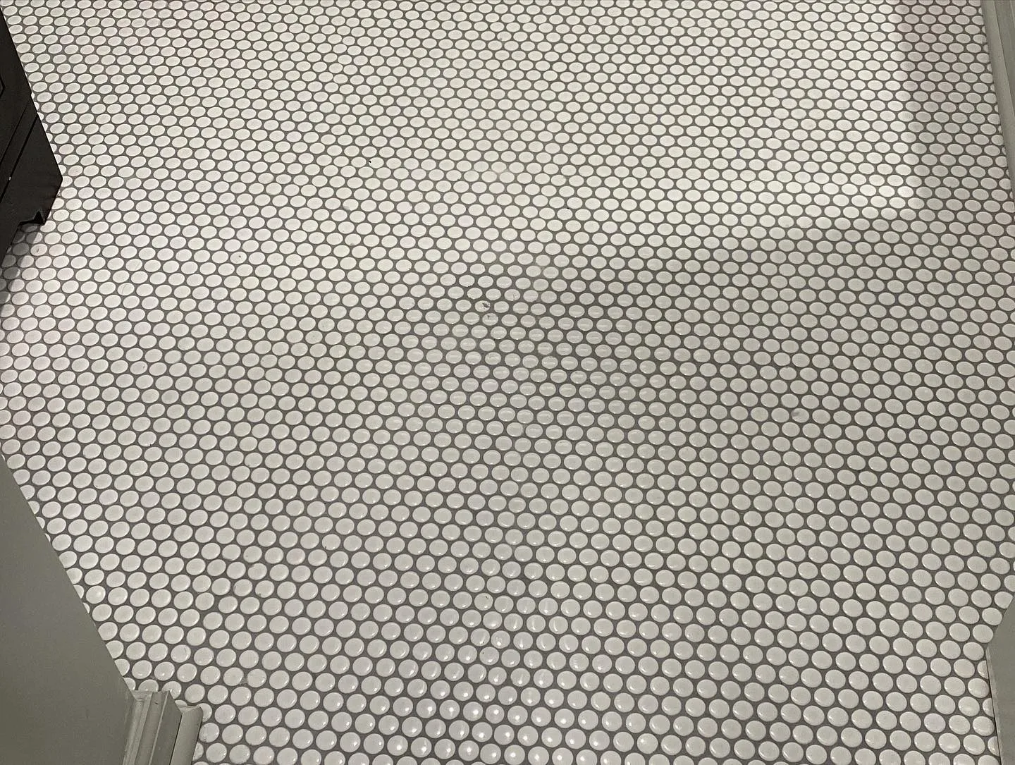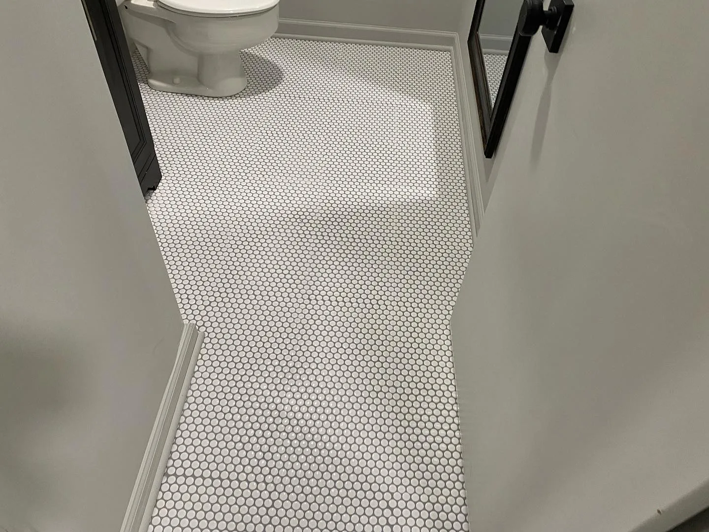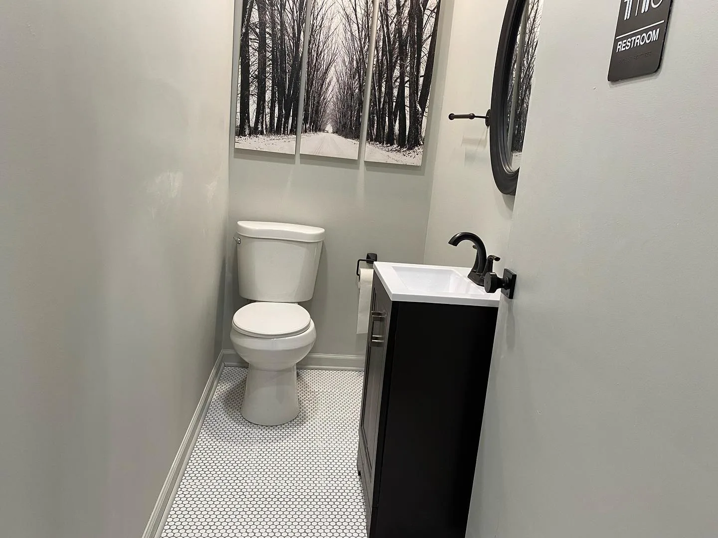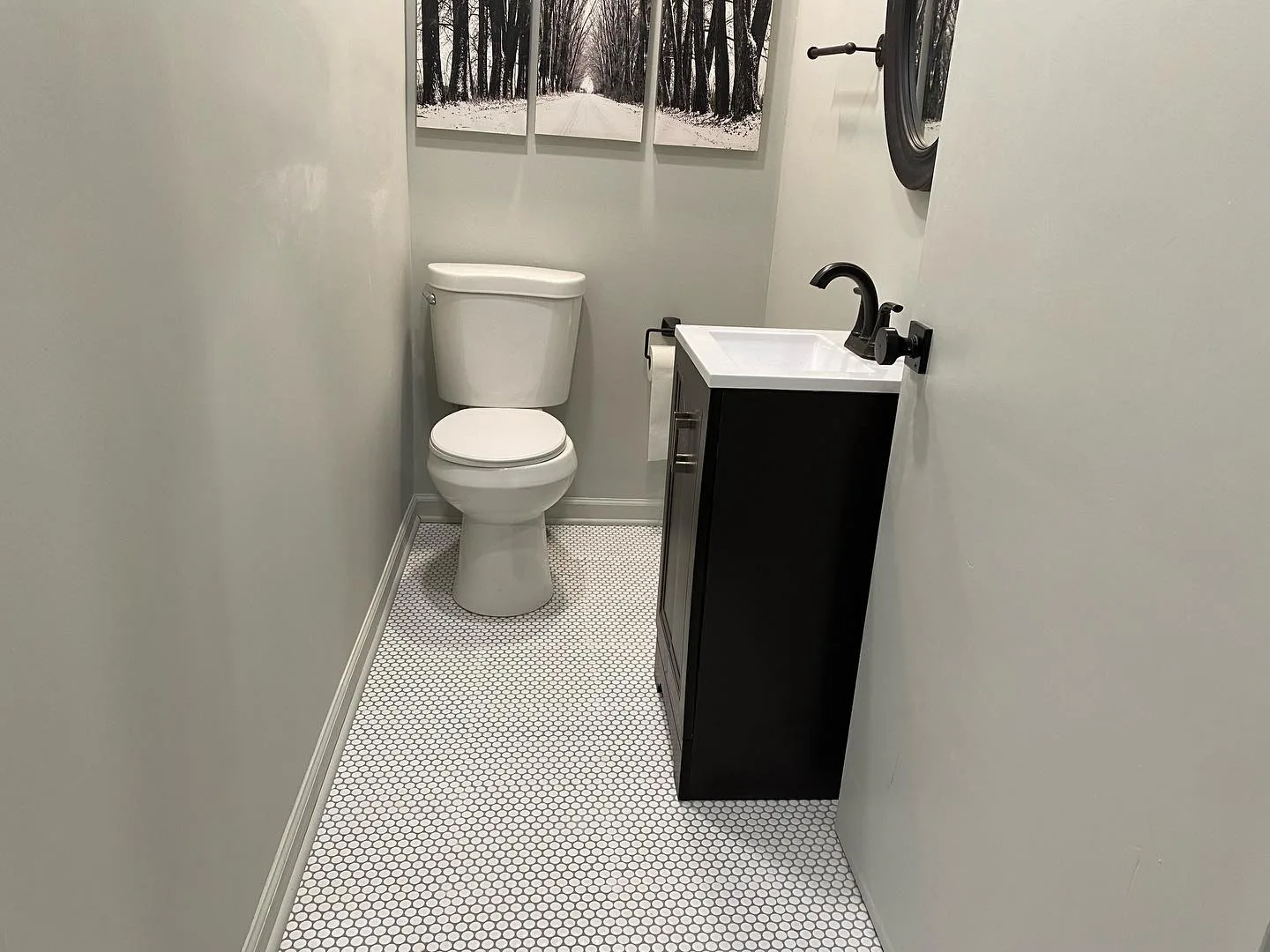 This project involved the complete update of a commercial bathroom in Stratford, CT, to improve both functionality and accessibility. First, the existing flooring was replaced with durable white penny mosaic tiles, establishing a clean, slip-resistant surface. Subsequently, a compact black vanity with a modern matte black faucet was installed to maximize spatial efficiency. Furthermore, ADA-compliant stainless steel grab bars were securely mounted alongside the toilet to ensure proper safety standards are met. Overall, the renovated space provides a practical, well-lit environment strictly tailored for everyday commercial use.