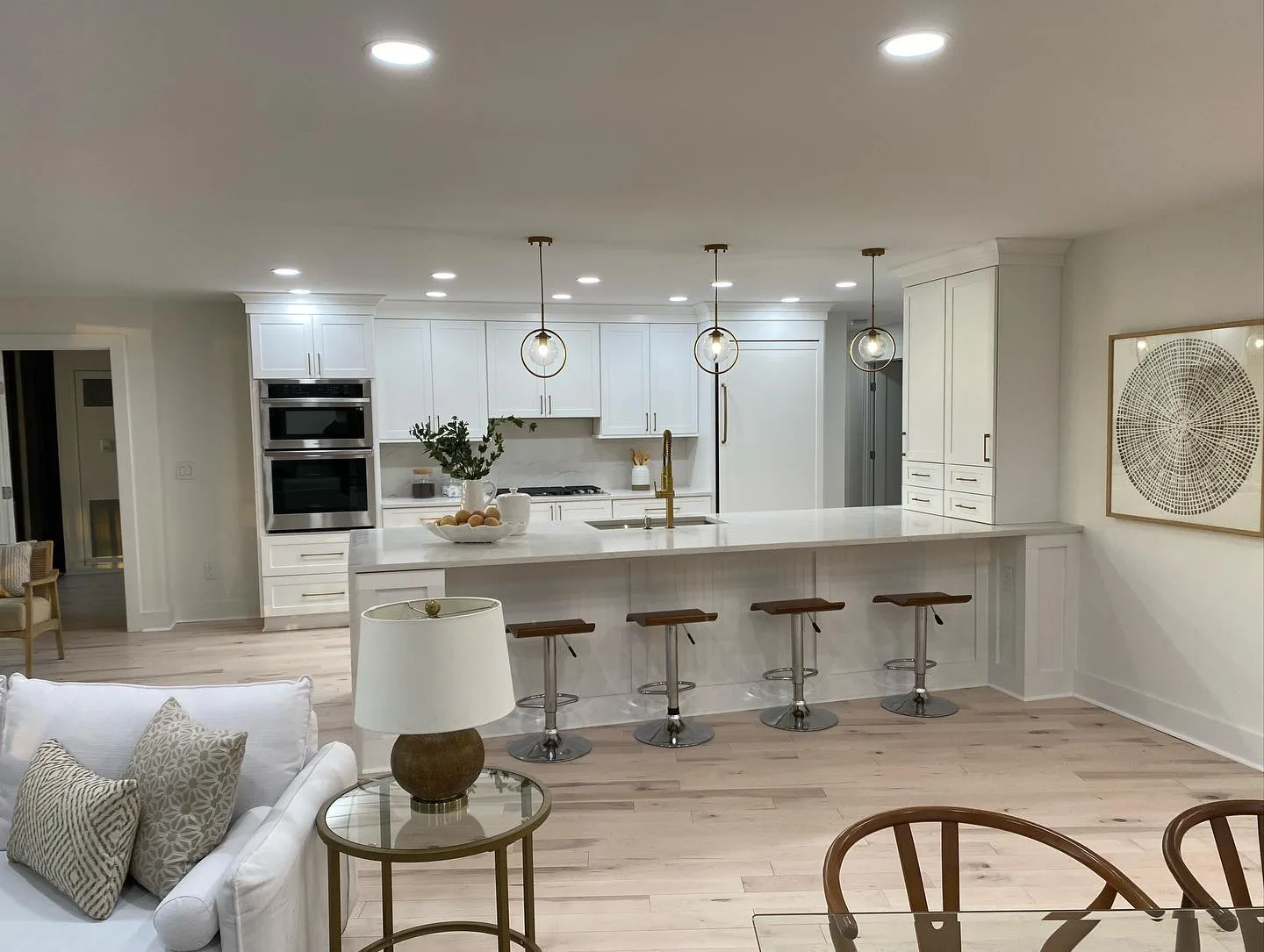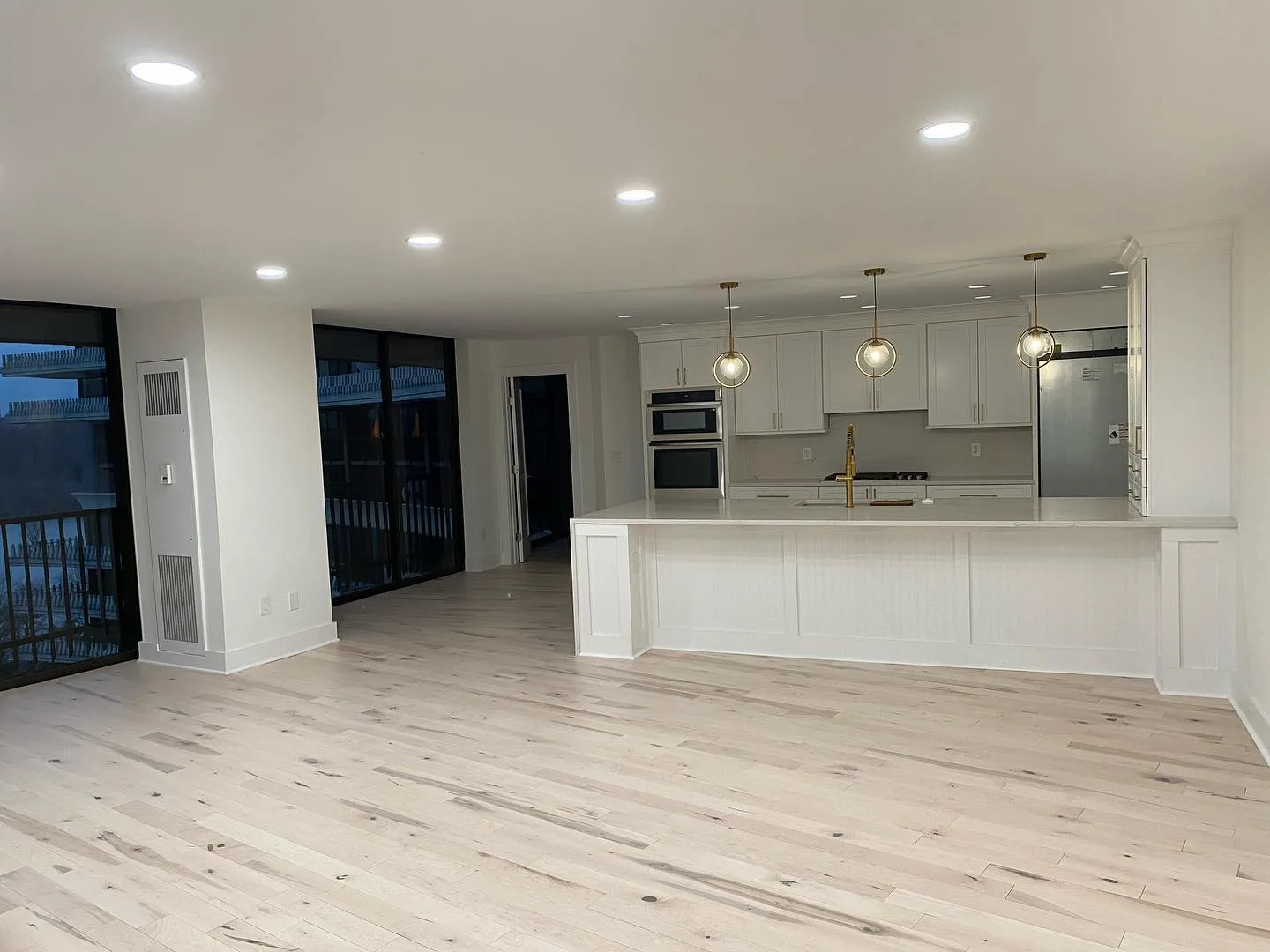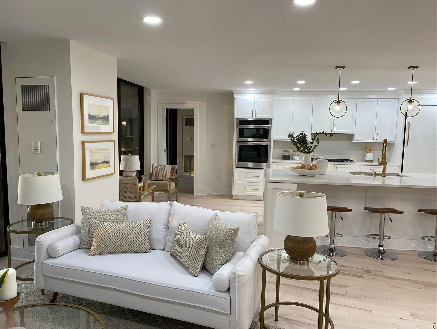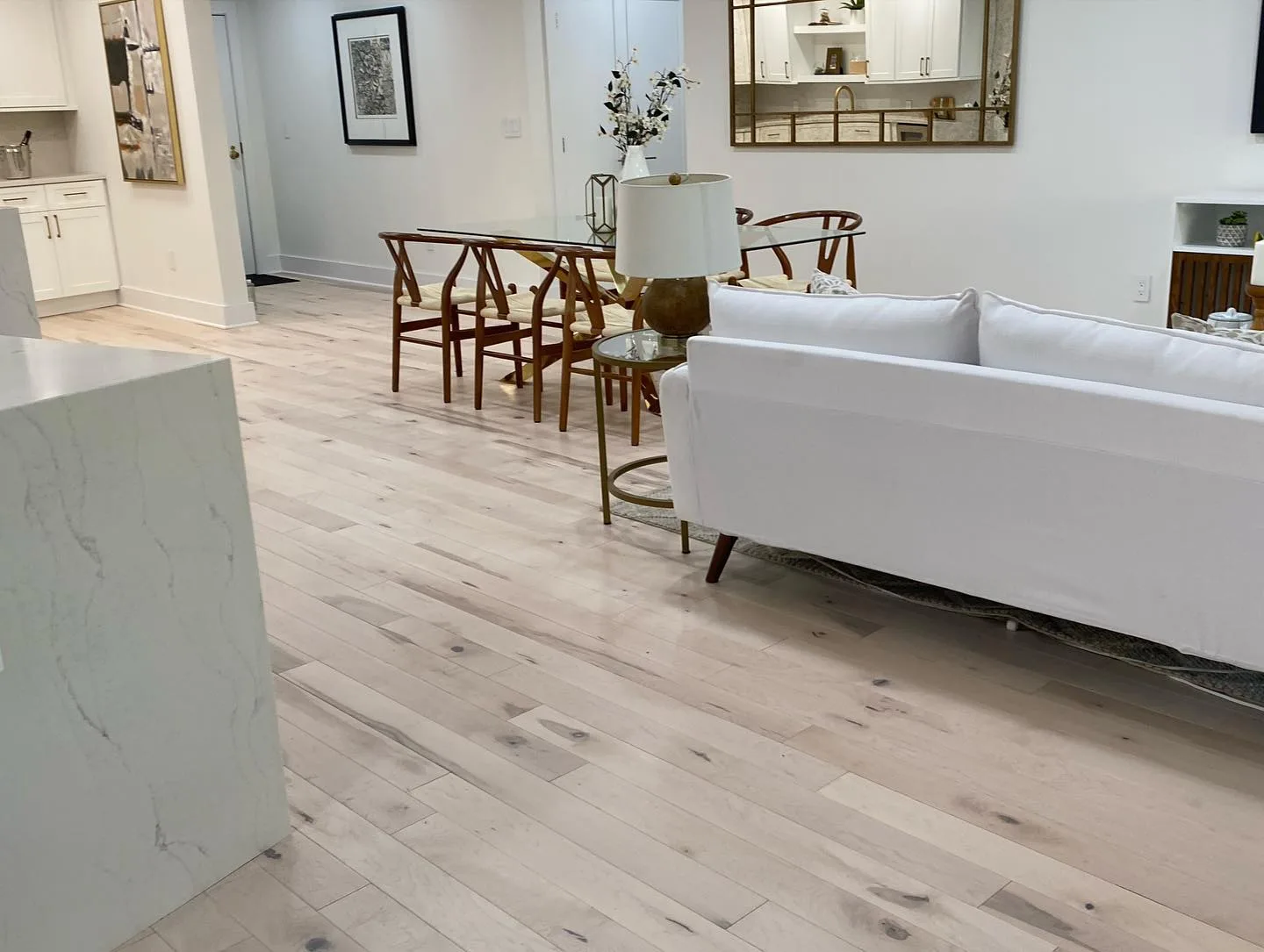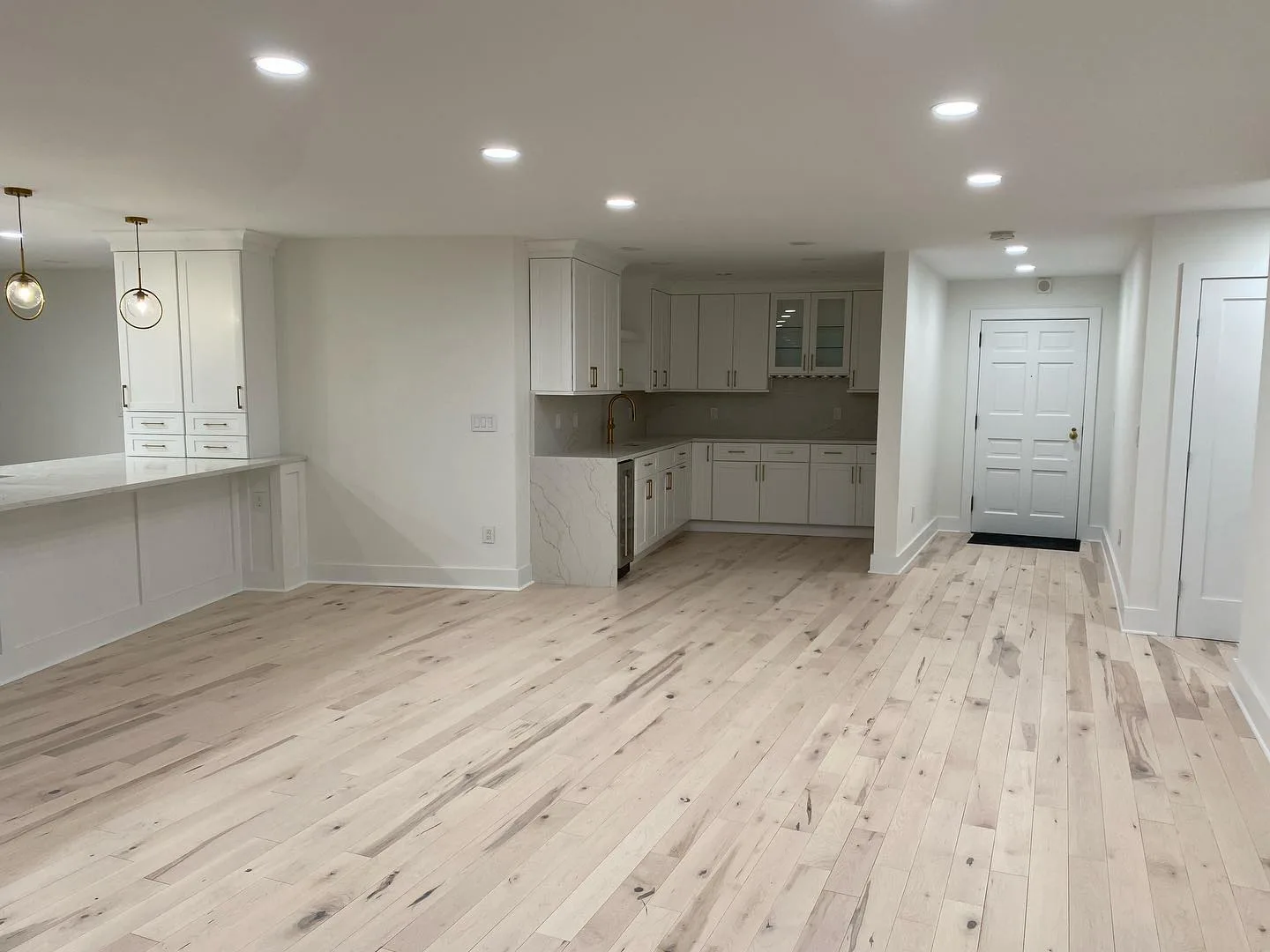 This project consisted of a comprehensive modern apartment renovation designed to create a bright, cohesive, and functional living space. Initially, the team focused on the foundational elements, which included removing the old surfaces and installing light-toned, natural wood flooring throughout the entire unit. Furthermore, the kitchen was completely rebuilt with custom white shaker-style cabinetry, complemented by premium quartz countertops and a matching waterfall island. In addition to these structural updates, a full-scale interior painting service was performed, utilizing a clean, neutral color palette to enhance the natural light in every room. Consequently, all interior doors and hardware were replaced to match the updated aesthetic. Finally, the project concluded with professional staging, strategically placing furniture to highlight the flow and versatility of the newly renovated open-concept layout.