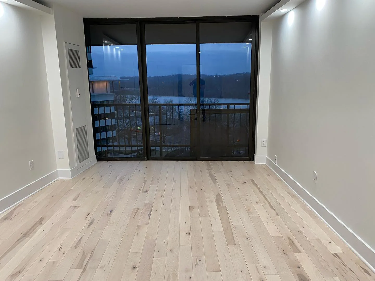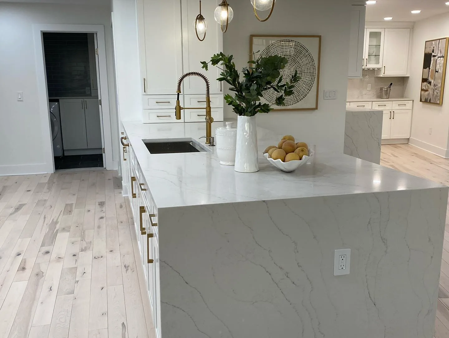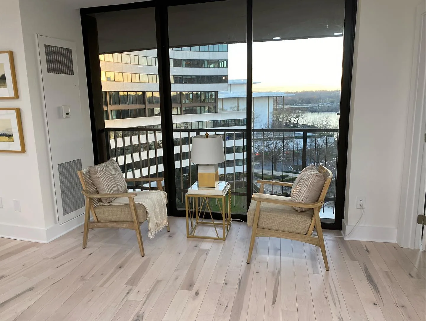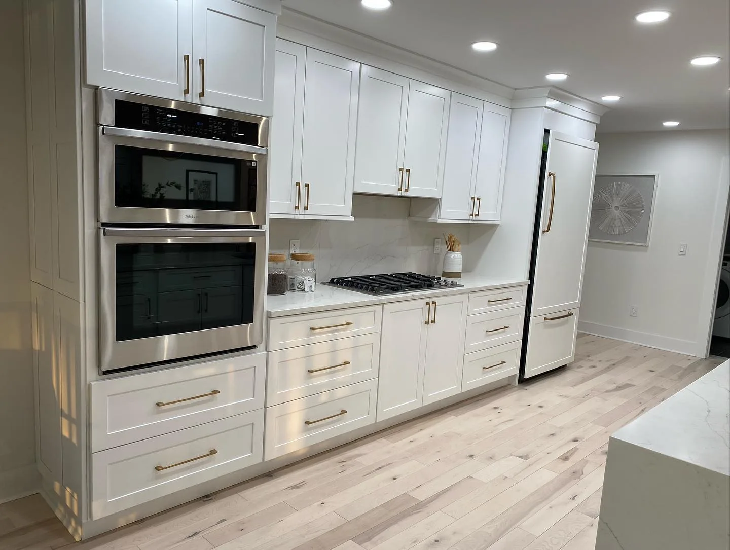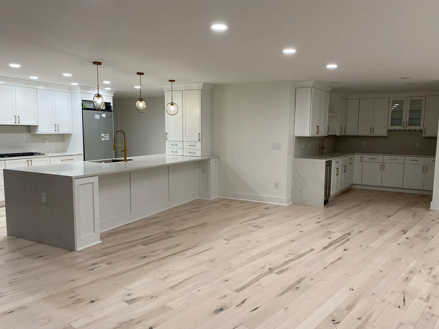 This project consisted of a comprehensive modern apartment renovation designed to create a bright, cohesive, and functional living space. Initially, the team focused on the foundational elements, which included removing the old surfaces and installing light-toned, natural wood flooring throughout the entire unit. Furthermore, the kitchen was completely rebuilt with custom white shaker-style cabinetry, complemented by premium quartz countertops and a matching waterfall island. In addition to these structural updates, a full-scale interior painting service was performed, utilizing a clean, neutral color palette to enhance the natural light in every room. Consequently, all interior doors and hardware were replaced to match the updated aesthetic. Finally, the project concluded with professional staging, strategically placing furniture to highlight the flow and versatility of the newly renovated open-concept layout.